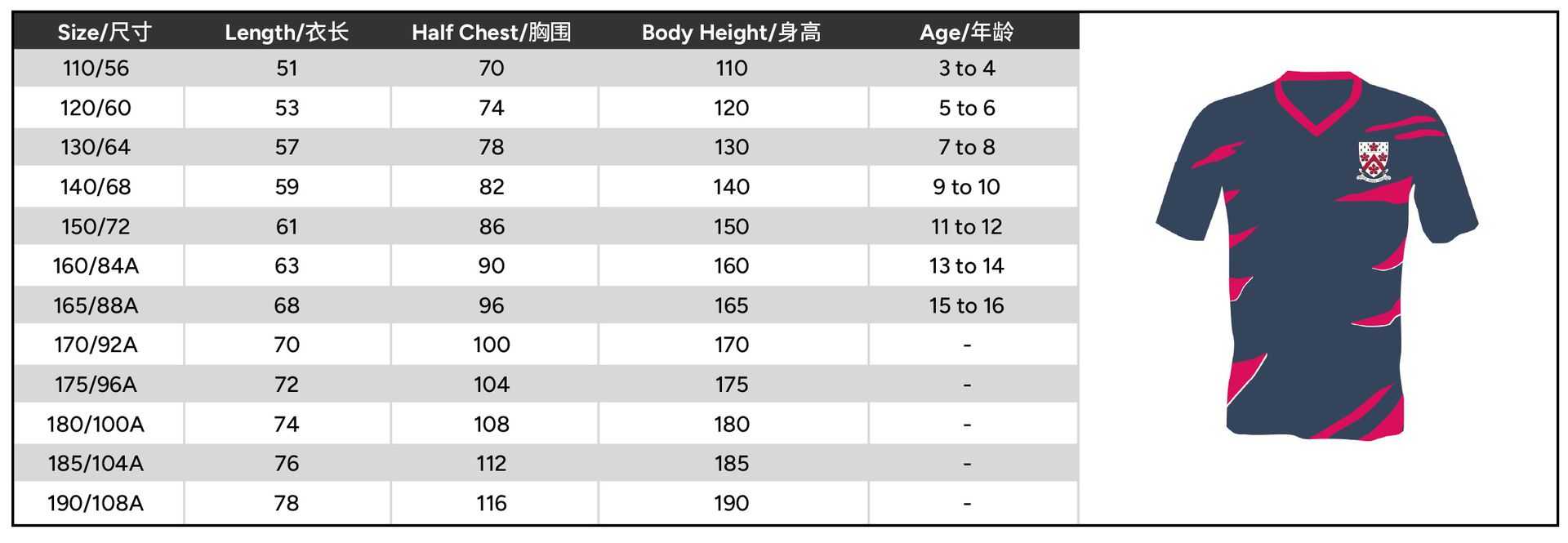 Size 110 or 120 or 130 or 140 or 150 or 160 or 165 or 170 or 175 or 180 or 185 or 190