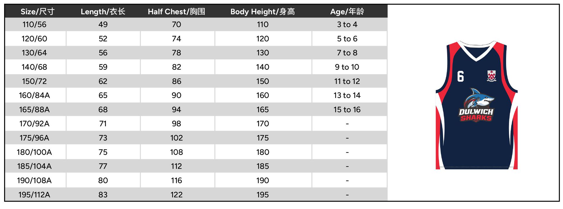 Size 110 or 120 or 130 or 140 or 150 or 160 or 165 or 170 or 175 or 180 or 185 or 190 or 195