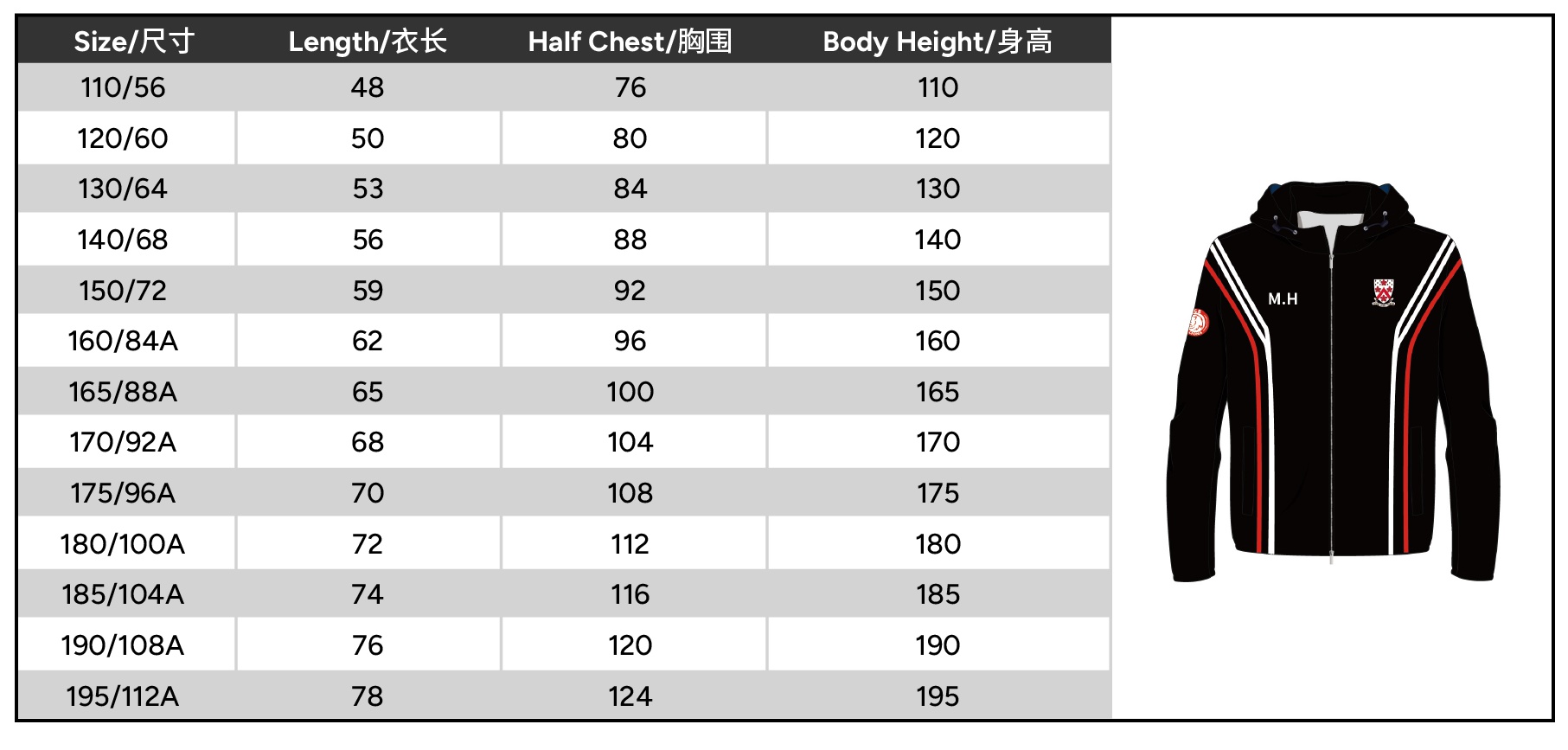 Size 110 or 120 or 130 or 140 or 150 or 160 or 165 or 170 or 175 or 180 or 185 or 190 or 195
